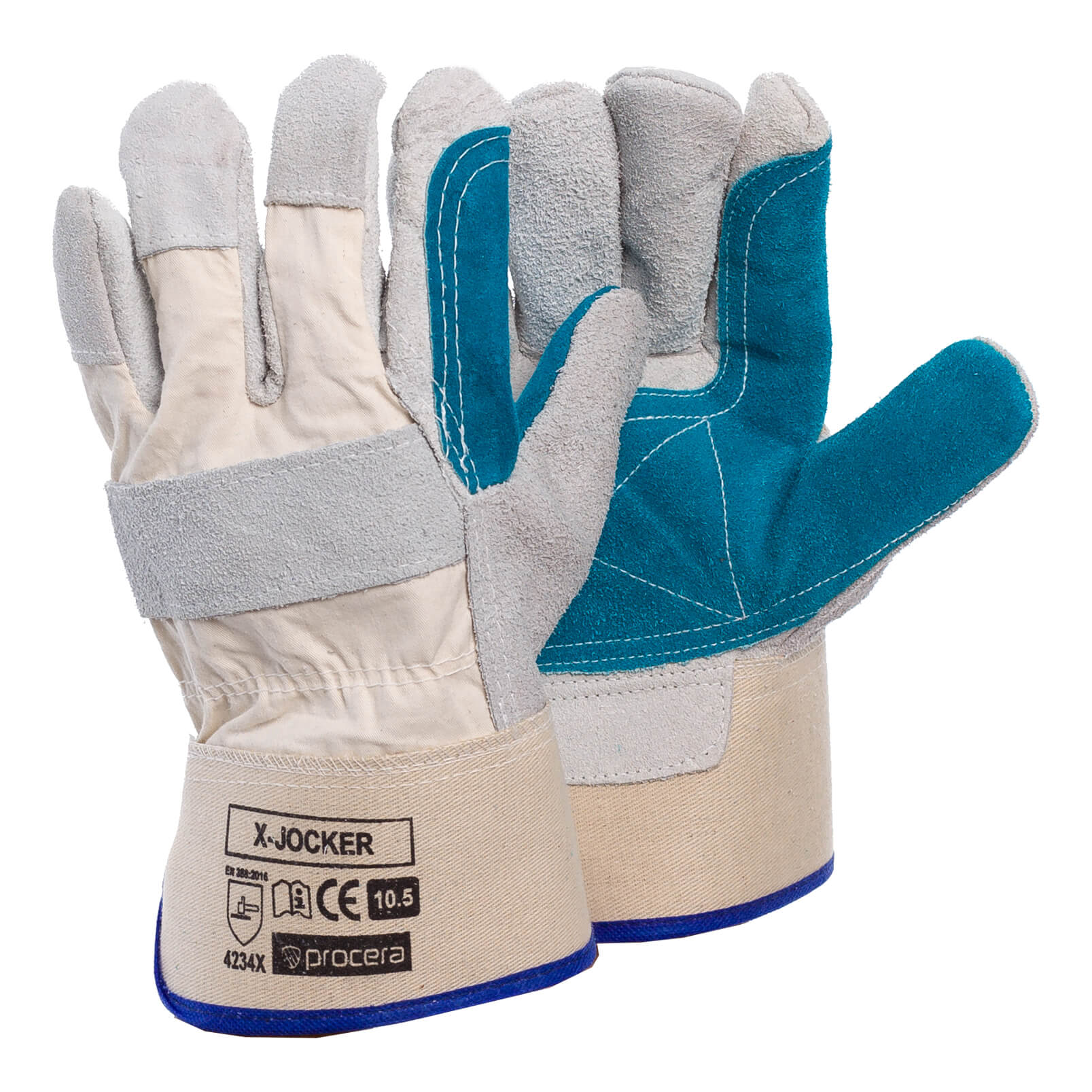 Päťprstové rukavice JOCKER s celokoženou dlanou a z bavlnenej látky na chrbte. Rukoväť je vyrobená z vysoko kvalitnej štiepanej hovädzej kože v prírodnej farbe. Rukoväť, ukazovák a palec sú dodatočne vystužené vrstvou modrej štiepanej hovädzej kože. Chrbát, metakarpálna línia a končeky prstov sú tiež vystužené štiepanou kožou. Manžeta je pogumovaná a zakončená lemom, nad ktorým je všitá šnúrka pre pohodlie a jednoduché používanie. Vnútorná strana rukoväte je zakončená mäkkou podšívkou. Kategória II. Veľkosť: 10,5.