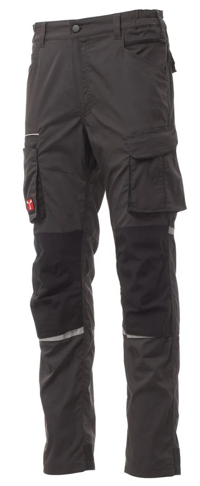 Strečové nohavice do pása, elastický pás, zapínanie na zips s gombíkom. Z prednej strany 2 tvarované vrecká, malé vrecko na mince na pravej strane a bezpečné vrecko na zips na ľavej strane. Vrecko na ľavej nohavici na suchý zips s držiakom na ID kartu. Vrecko na pravej nohavici a vrecko na telefón. Vrecká na kolenačky v kontrastnej farbe. Na zadnej strane 2 vrecká a vrecko na skladací meter na pravej nohavici. Zosilnený spodný lem v kontrastnej farbe. Zosilnené švy v oblasti rozkroku a na vnútornej a vonkajšej strane nohavíc. Materiál polyester 50%, bavlna 26% a elastomultiestere 24%.